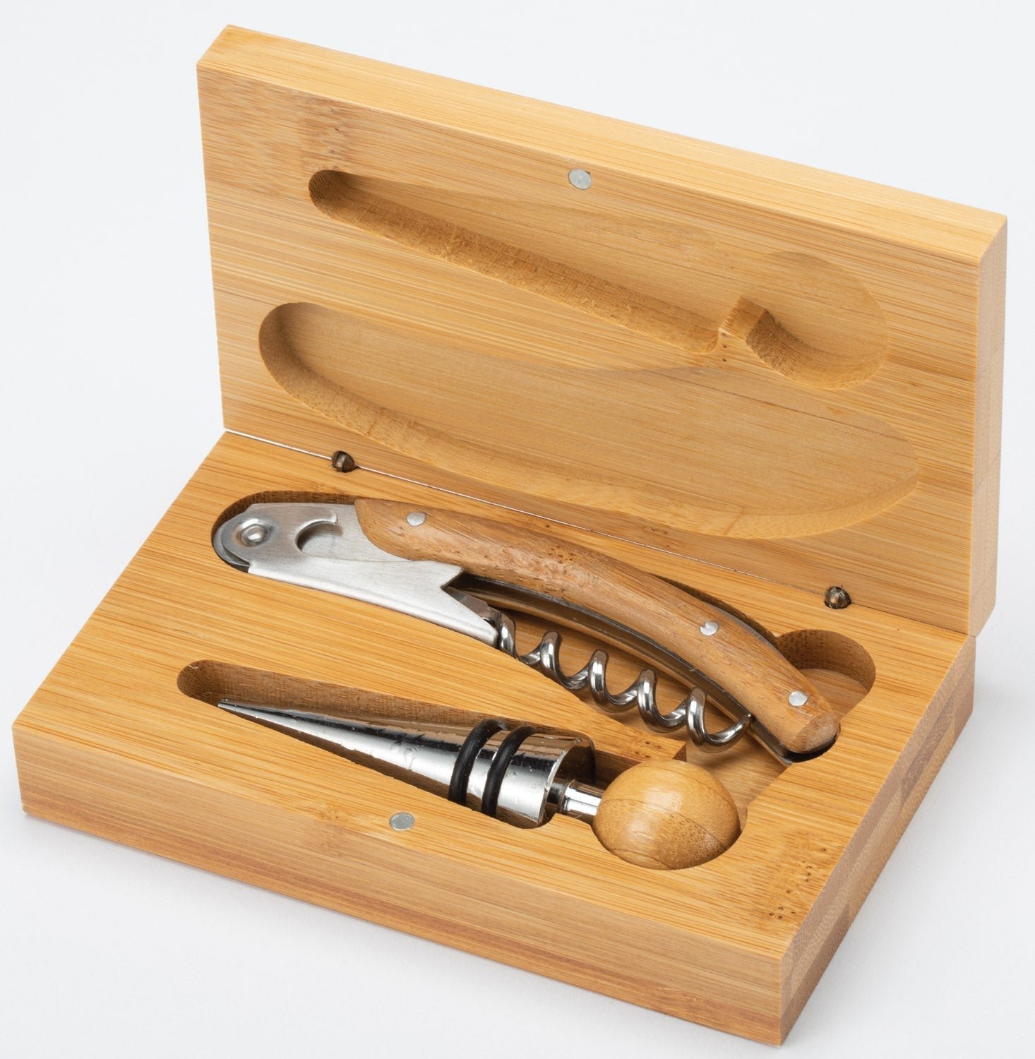 Genuine Bamboo Wine Tools Set is that is Laserable and includes a gift box