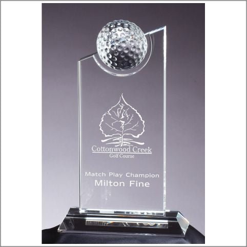 An Elegant Tall Crystal Award With 3-D Fully Dimpled Golf Ball And Fully Laser And Rotary Engravable. Includes A Deluxe Velour Lined Presentation Box