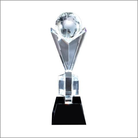 A Statuesque Frosted And Clear World Globe Atop A Victory Crystal Pedestal Mounted On Black Base, Laserable With Deluxe Velour Lined Presentation Box
