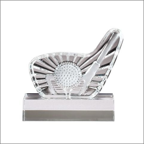 A Sculpted Glass Award Depicting A Golf Club Head And Ball On Matching Glass Base; Includes Velour Lined Presentation Box.