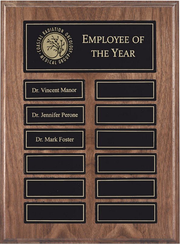 Walnut finish perpetual plaque with 12 black engraving plates and matching header plate. Individually boxed.