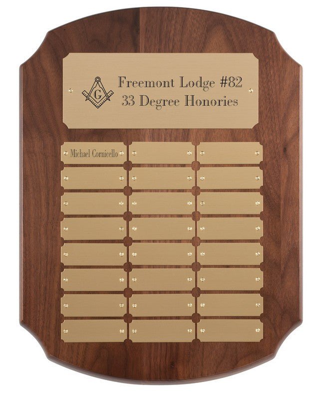 Genuine walnut perpetual plaque with 24 gold brushed brass engraving plates and matching header plate. Individually boxed.