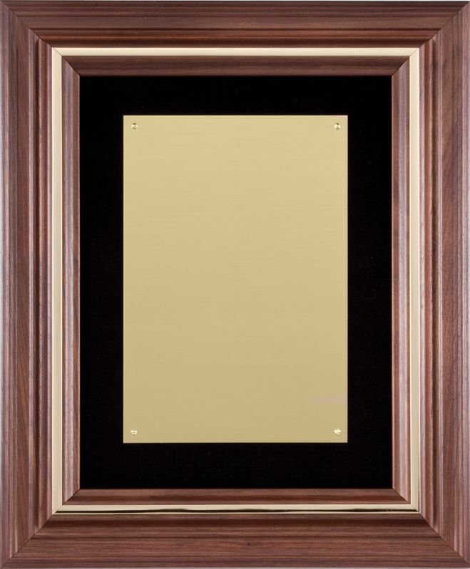 Genuine walnut frame with gold inlay border and brushed gold brass engraving plate. Individually boxed