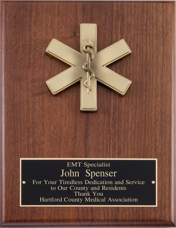Genuine Walnut Plaque with EMT Casting and black brass engraving plate. Box Included