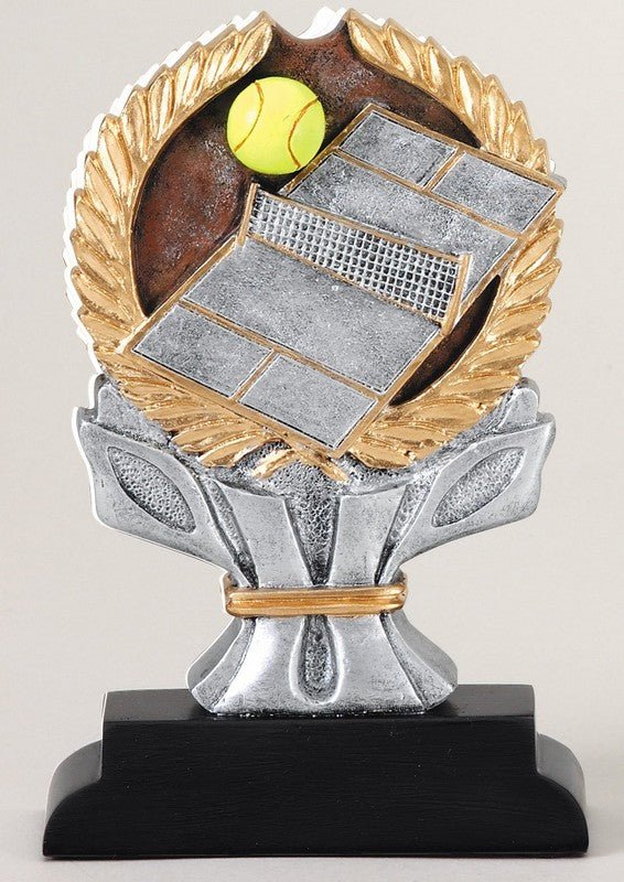 A Beautiful Full Color Resin Tennis Sport Award Mounted On A Black Finish Base And Designed With Room For A Engraving Plate