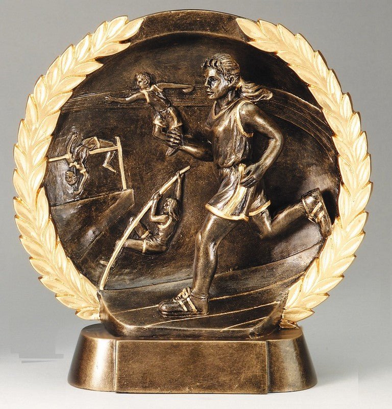 An Elegant High Relief Resin Track, Female Sport Award On An Antique Bronze Finish With Gold Finish Border