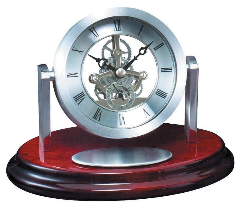 An Elegant Metal Skeleton Quartz Clock On Rosewood Piano Finish Base; Fully Laserable