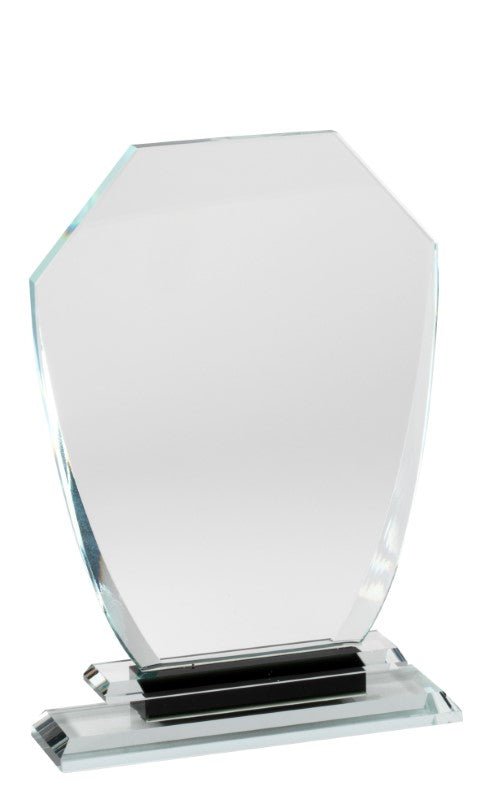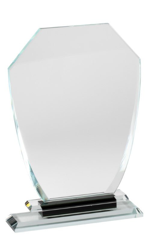 Elegant Shield Crystal with Black Riser on Clear Crystal Base, includes presentation box.