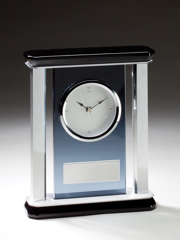 Elegant Smoked Blue Glass Desk Clock With Brushed Aluminum Accents, Pillars And A Plate For Personalization