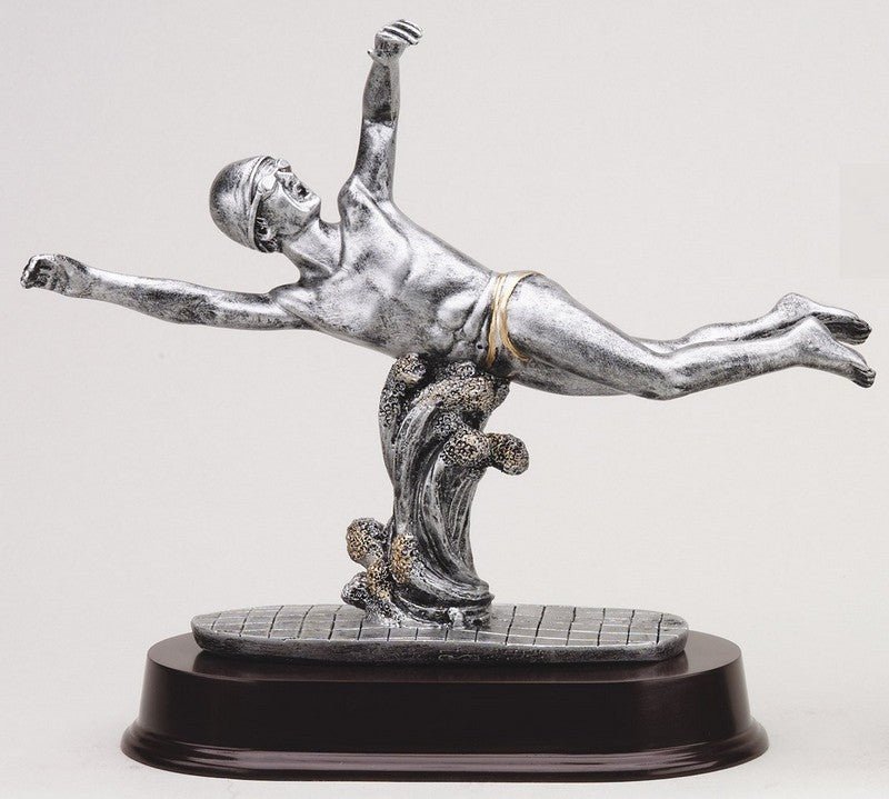 An Elegant Pewter And Gold Swim, Male Sport Award On Dark Finish Base With Room For An Engraving Plate