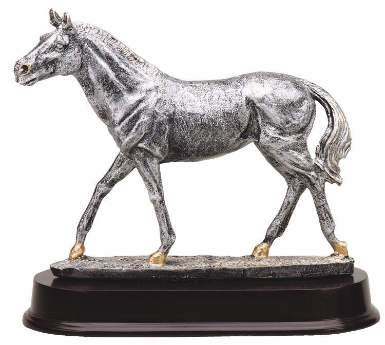 An Elegant Pewter And Gold Walking Horse Sport Award On Dark Finish Base With Room For An Engraving Plate